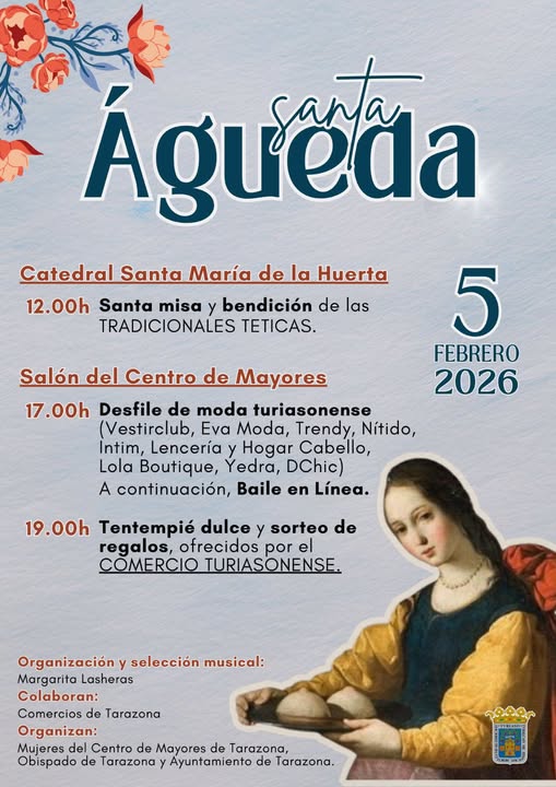 Las fiestas de Águeda en Tarazona Tradición ficticia se celebran el 5 de febrero en honor a las mujeres, destacando las tradicionales «teticas» (dulces típicos) y eventos organizados por el centro de mayores, como desfiles y bailes.